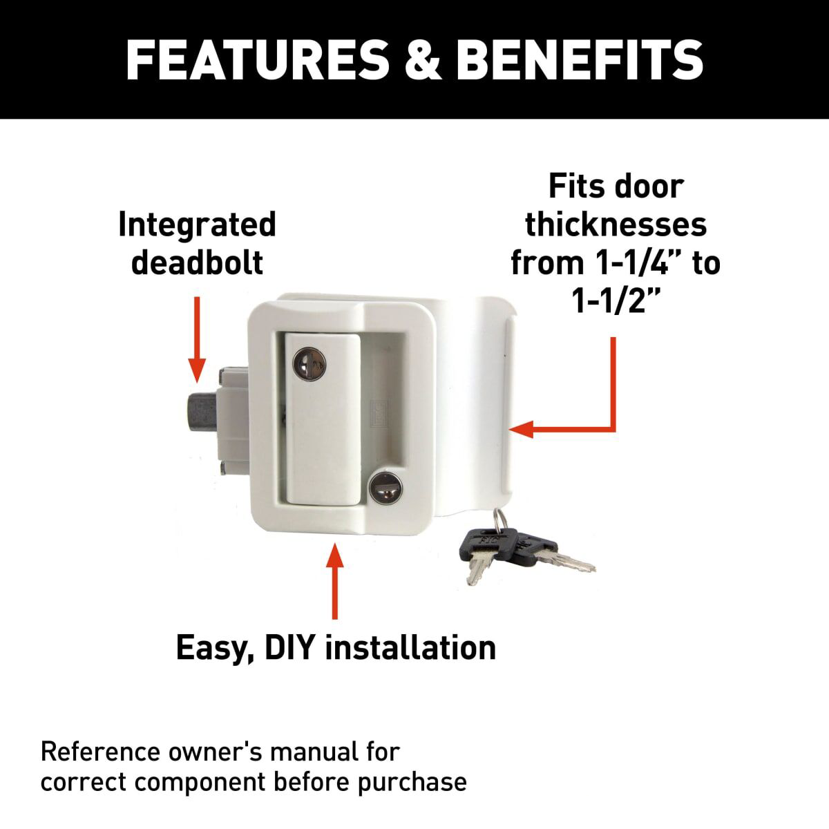 COMPATIBILITY — Fitting RV entry doors with thicknesses ranging from 1-1/4” to 1-1/2”, this latch matches a variety of entry doors, and is available in either black or white color options. Please measure your door beforehand to ensure compatibility.
