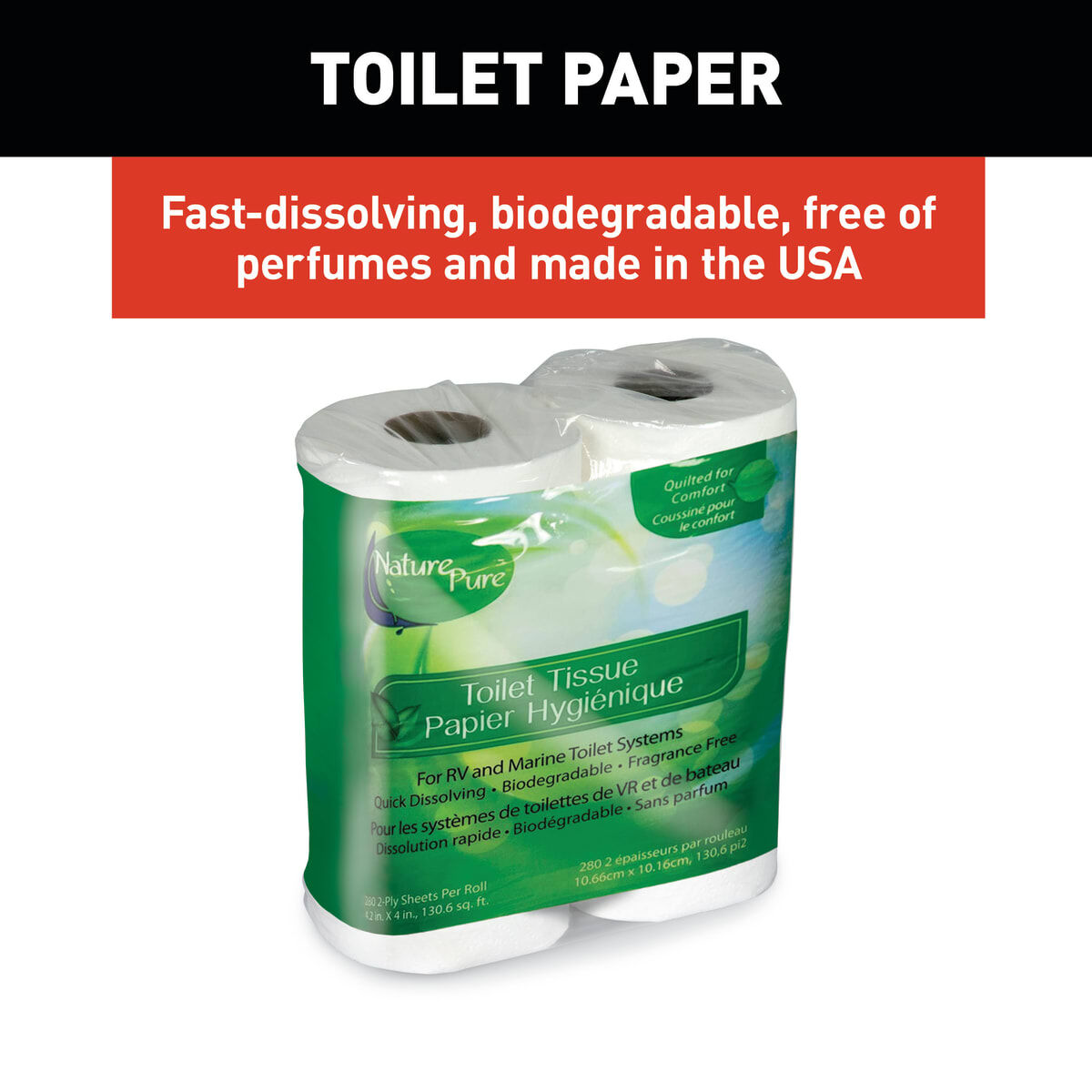 Toilet Paper — Our RV-safe, fast-dissolving 2-ply toilet paper is a must for new RV owners. It’s biodegradable, free of perfumes and made in the USA. Our standard RV starter kit includes eight rolls at 280 sheets per roll, giving you plenty to start your open road adventures.
