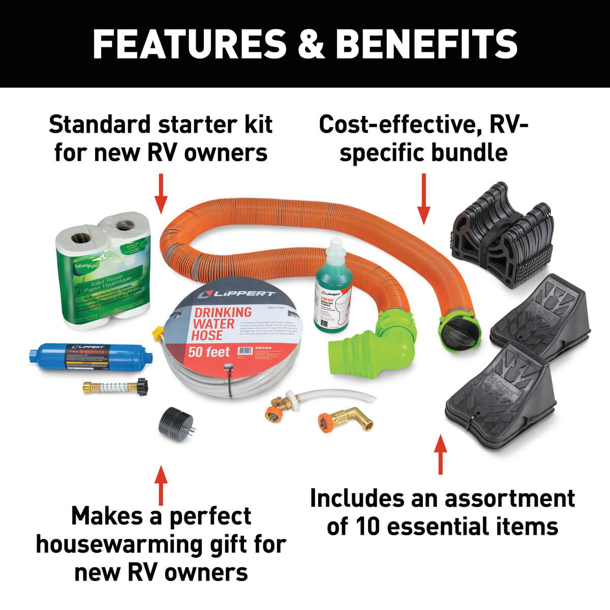 Don't bother with the new owner checklist - just dive into the Lippert RV starter kit and start your RV adventure right away! This must-have kit has all the essentials for newbie RVer's to hit the road with confidence.