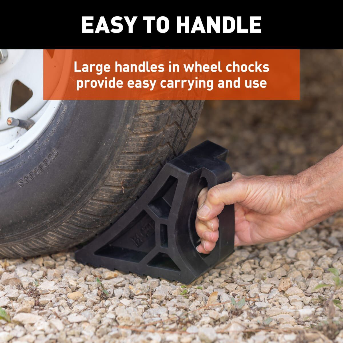 - BUILT FOR SAFETY - These wheel chocks help prevent roll-away of unattended trailers, RVs, or vehicles and can also be used to stabilize trailers or vehicles when camping or securing a trailer without a hitched vehicle