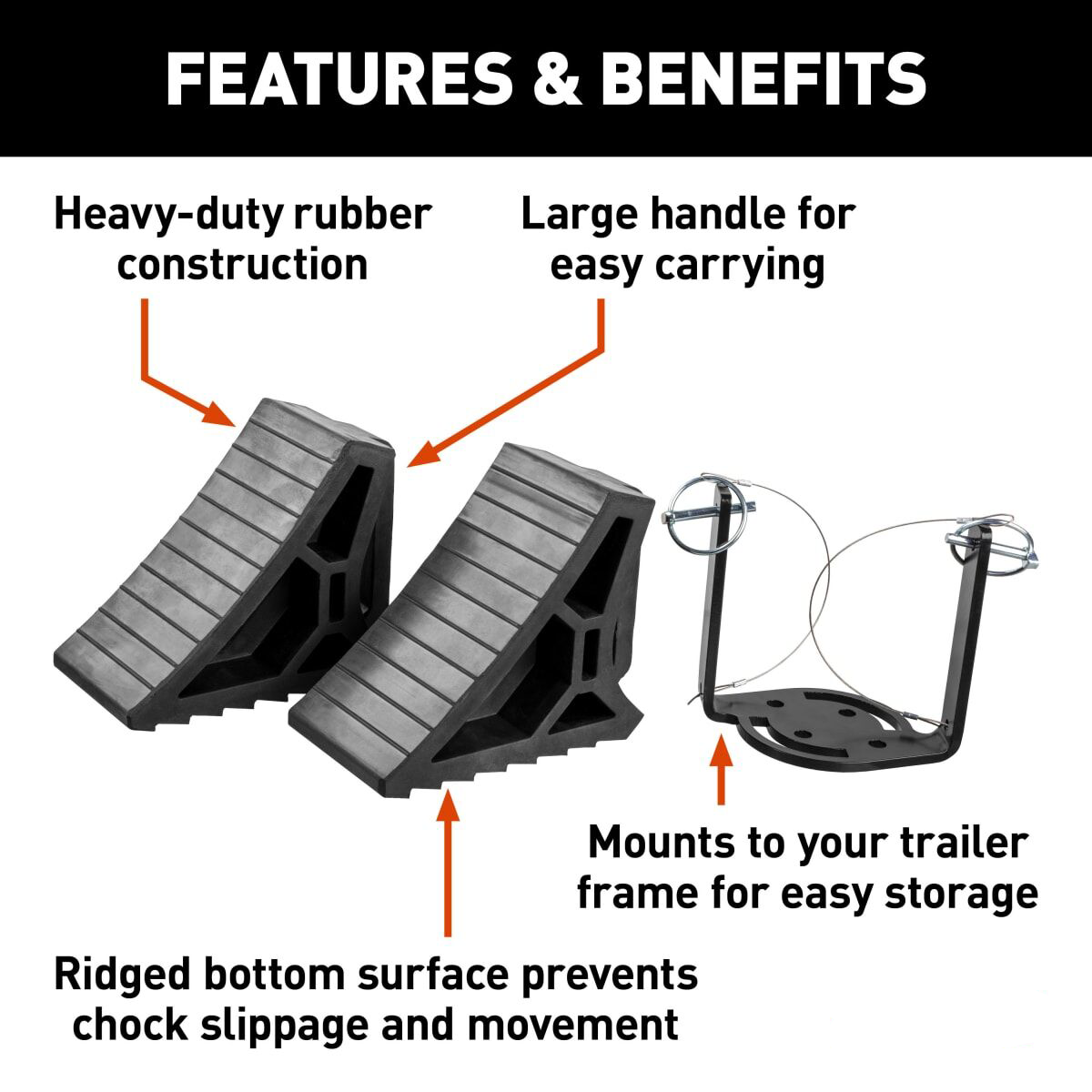- STRONG CONSTRUCTION - Made with heavy-duty rubber which provides improved traction and prevents chock slippage or movement, and the high-density steel bracket is built to last and avoids bending or breaking with use
