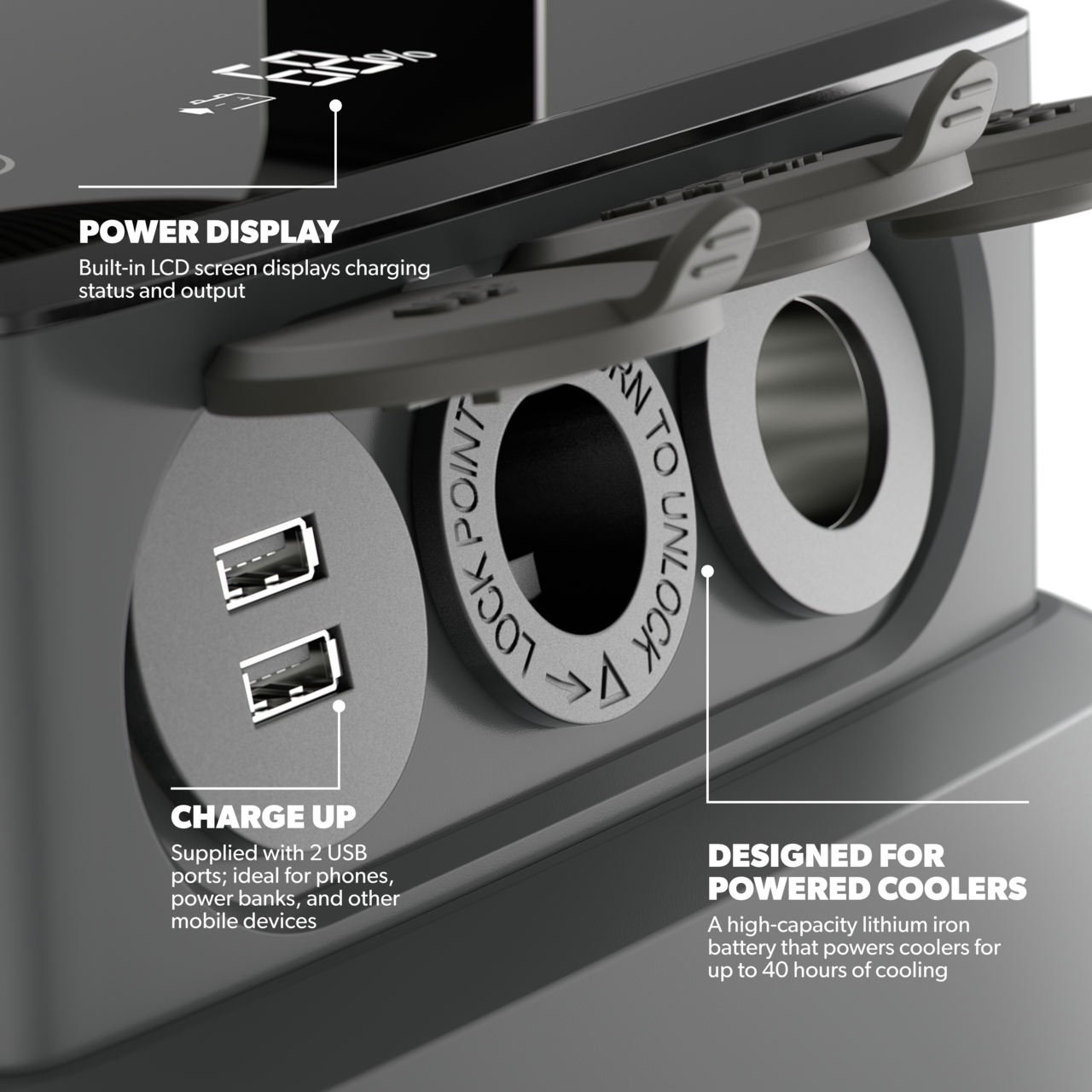 The Dometic PLB40 Ah Lithium Iron Phosphate battery is the ultimate power source for your adventures. Say goodbye to being tied to an outlet and hello to true off-grid independence. This compact and lightweight battery is perfect for powering coolers and other 12 V appliances on the go. The LCD screen displays the charging status and output, while the USB ports and 3-way charging provide easy and versatile use. Now you can truly go off-grid and power your journey with ease!