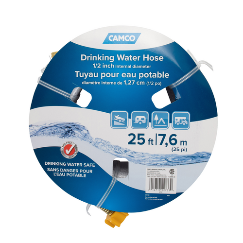 Camco's TastePURE 25-Foot Drinking Water Hose with a ½-inch ID is reinforced for maximum kink resistance. Made of NSF certified FWH hose, this PVC hose is lead-free, BPA-free, phthalate-free and certified to NSF/ANSI/CAN 61 for drinking water. It is CSA lead-free content certified to NSF/ANSI 372 and compliant with all federal and state level lead-free laws. UV stabilized for long life. Made in the USA.