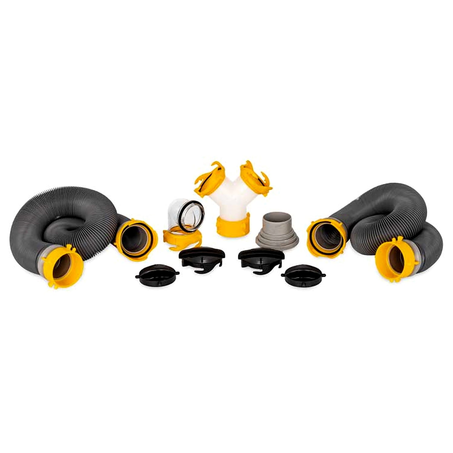 - Includes: (2) 10-foot super heavy-duty 18mil HTS vinyl sewer hoses with pre-attached swivel bayonet and lug fittings, (1) transparent elbow with 4-in-1 adapter, (1) translucent swivel wye fitting, and (4) storage caps