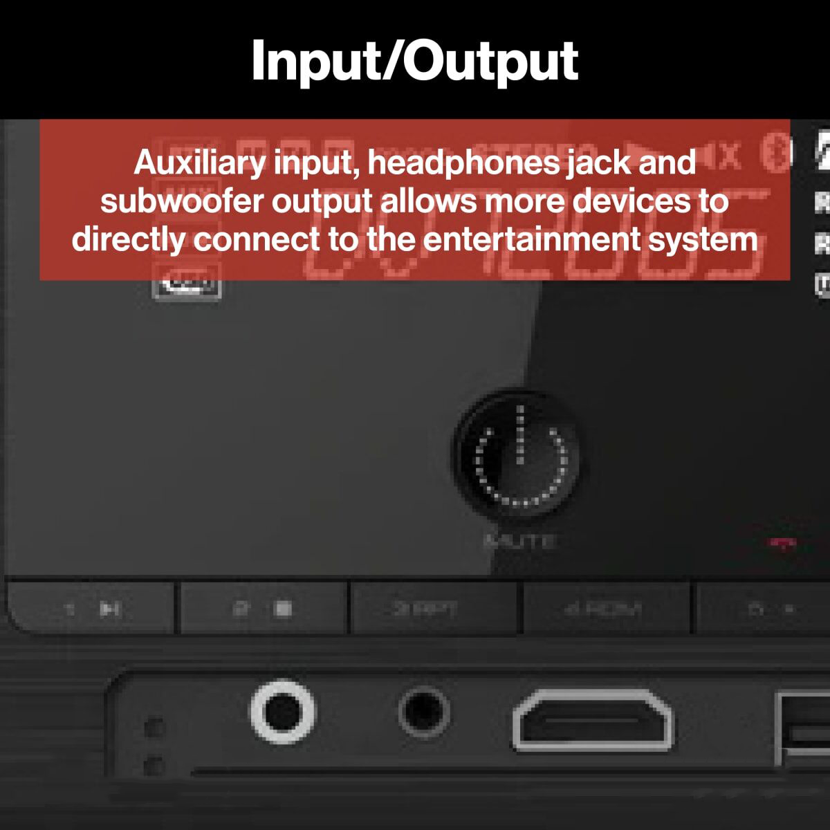 - INPUT / OUTPUT - The auxiliary input allows more devices to directly connect to the entertainment system. The headphones jack and subwoofer output provide a custom experience