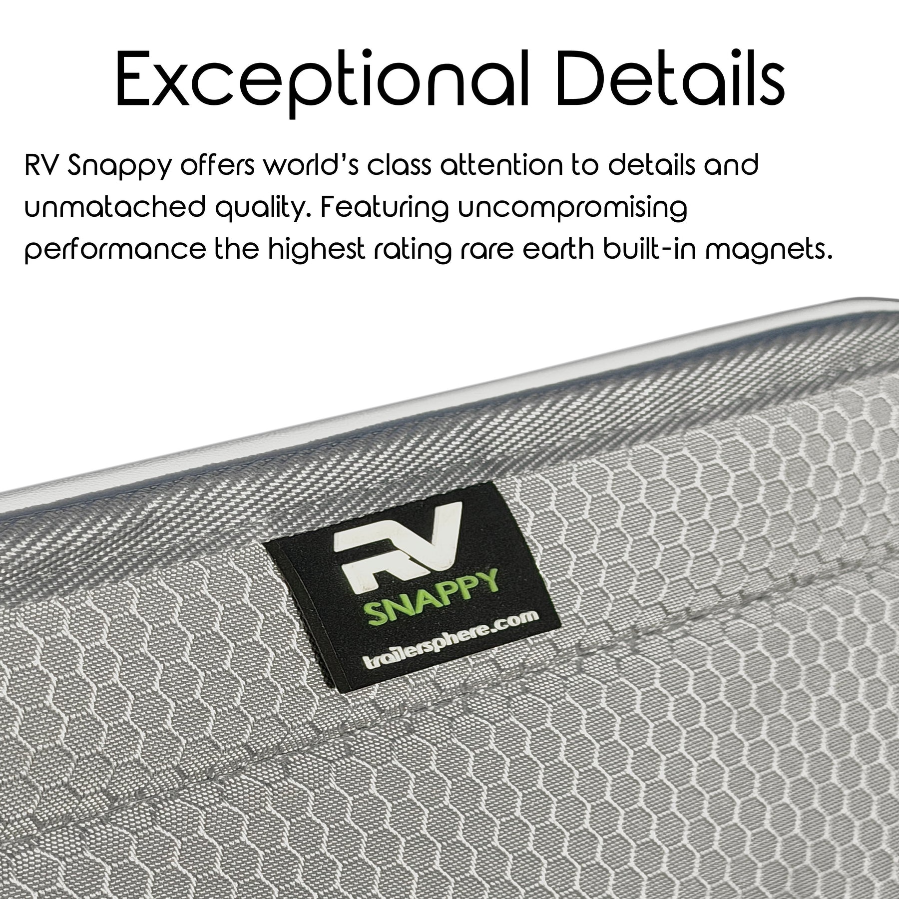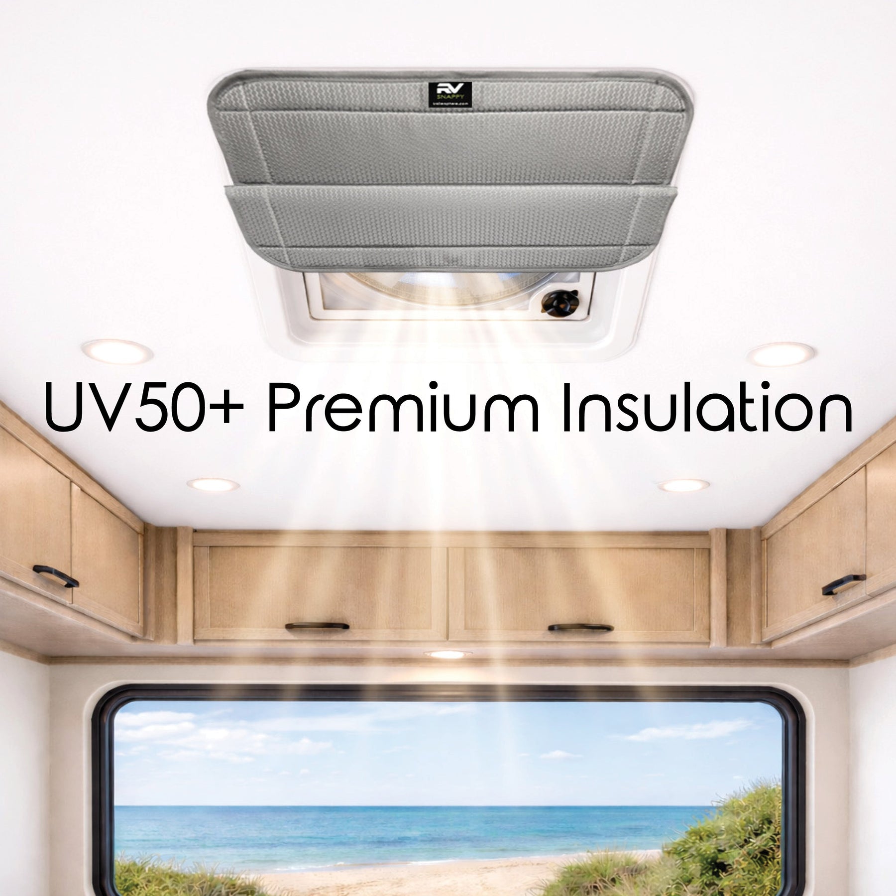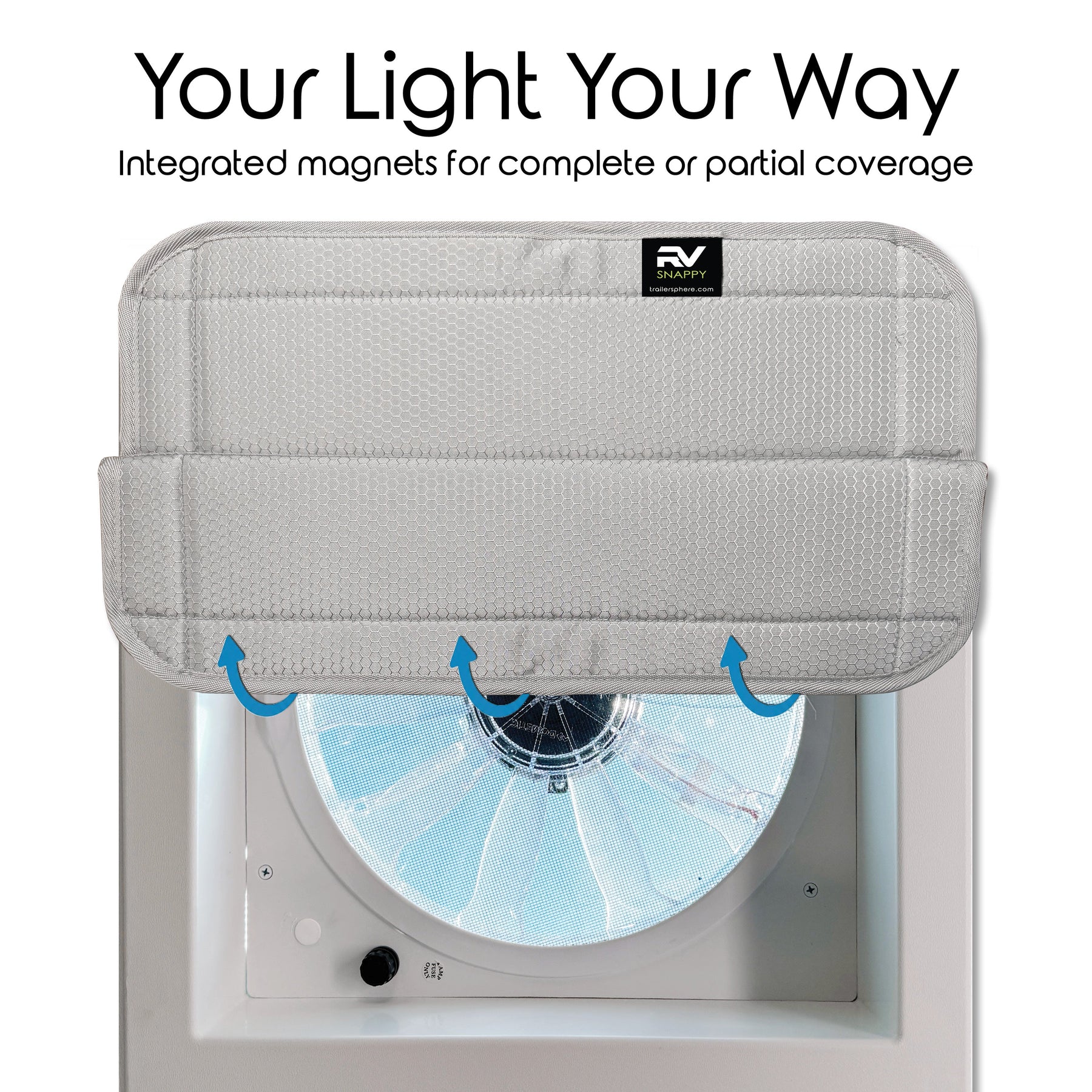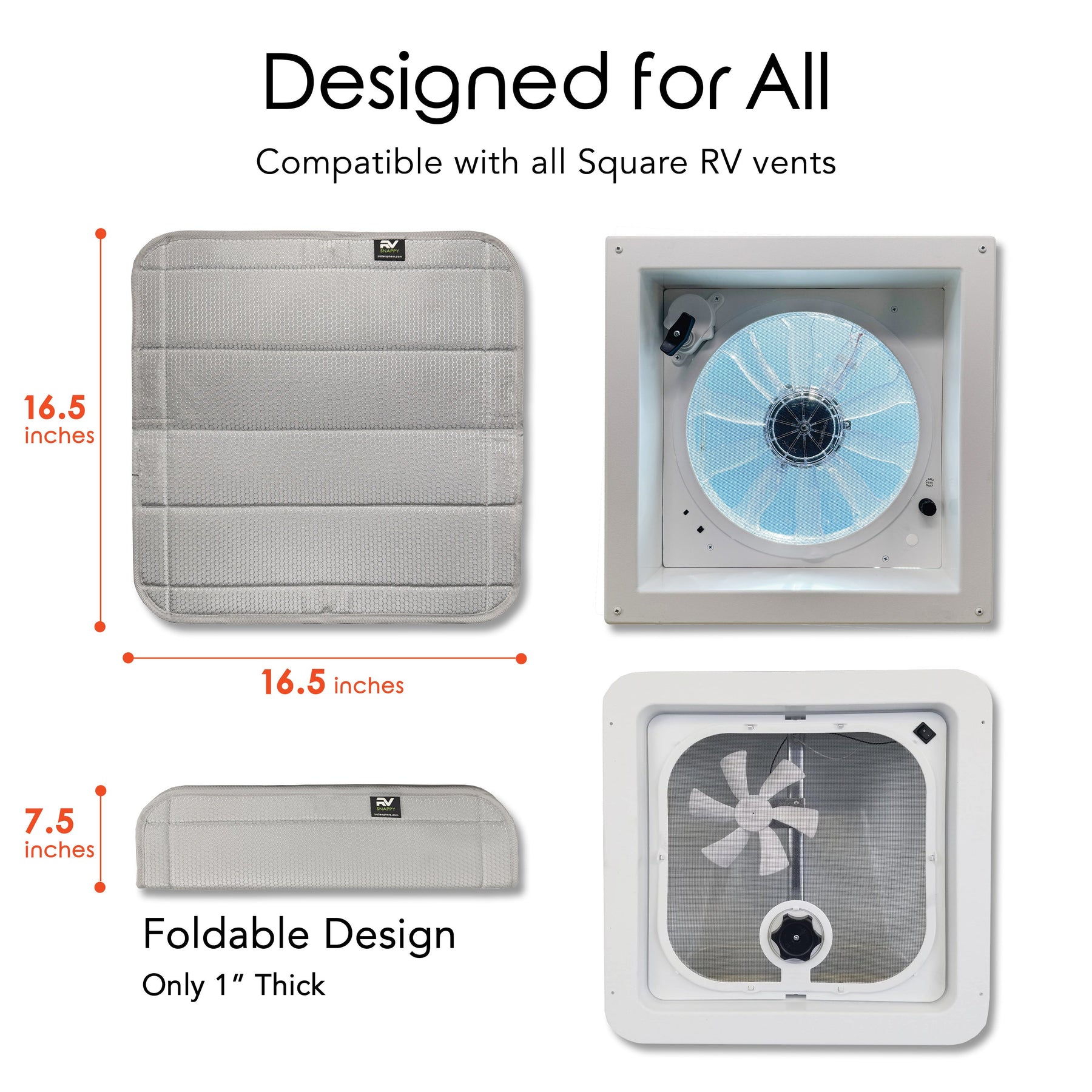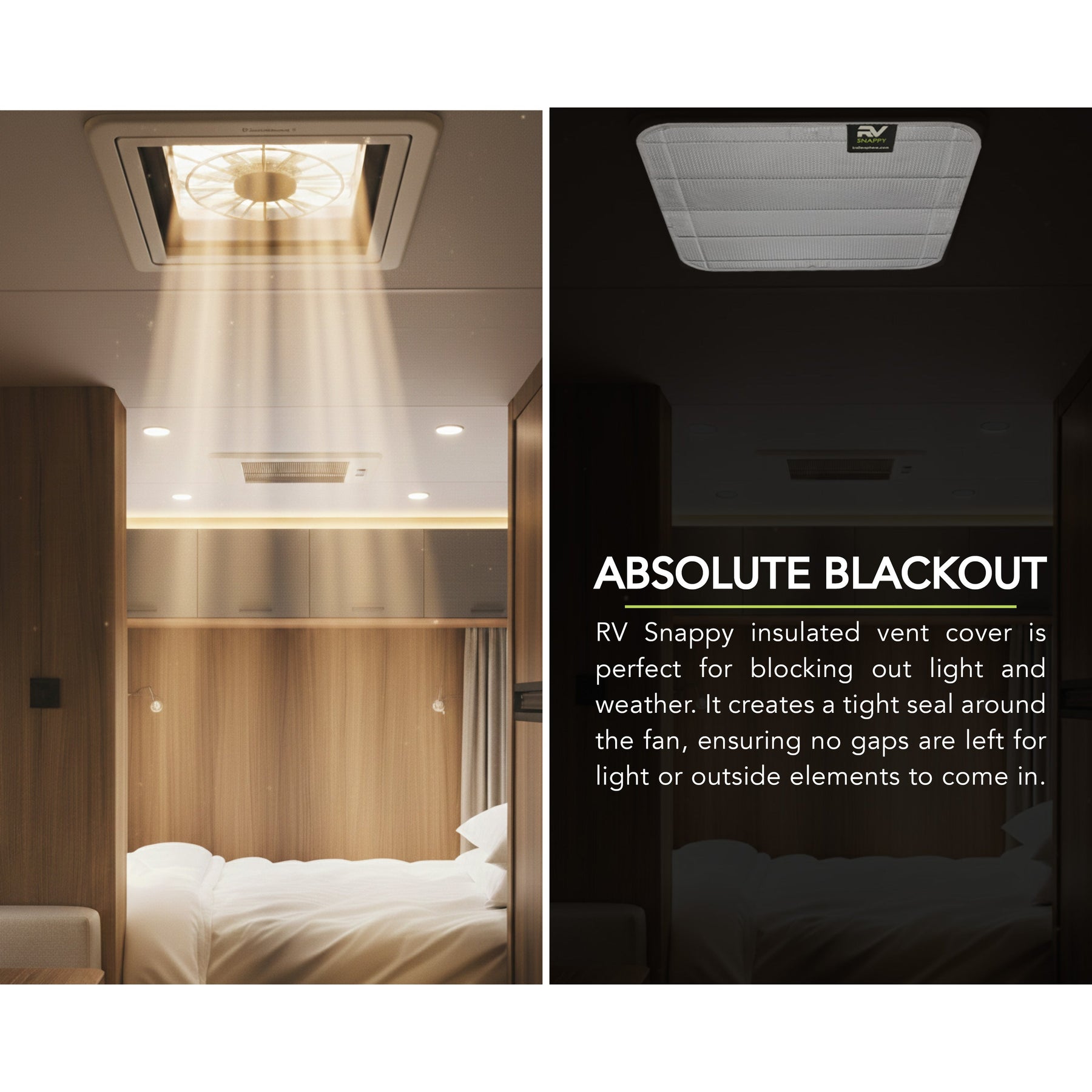 RV Snappy is an innovative magnetic insulated vent cover perfect for blocking out light and weather. It creates a tight seal around the fan, ensuring no gaps are left for light or outside elements to come in. It is compatible with most standard fans, measuring 16.5 inches by 16.5 inches. Designed for Maxair or any square shaped vent, these covers fit well with any RV and are ideal for those who love adventures. Protect your space from unwanted light and feel at ease with these easy-to-use vent covers.