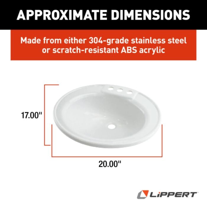 Refresh your bathroom or RV with this striking Lippert Oval Lavatory Sink, engineered for those who demand quality and style. The robust ABS acrylic construction resists scratches and stands the test of time, while weighing considerably less than fiberglass for simplified setup. At 17" x 20", it provides ample basin space without overwhelming your layout. Perfect for residential renovations or mobile living upgrades, this sink combines practical durability with contemporary appeal. Ready to install—faucet sold separately.